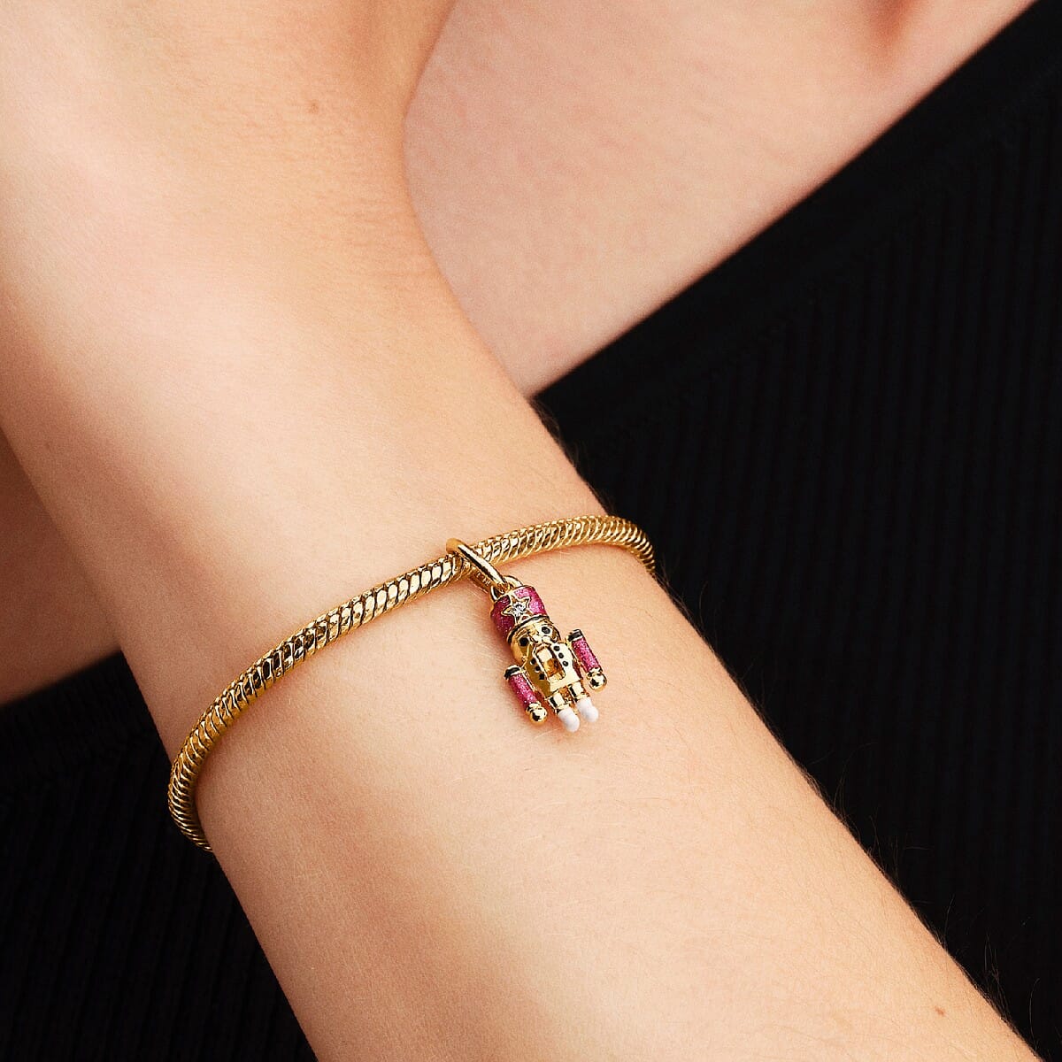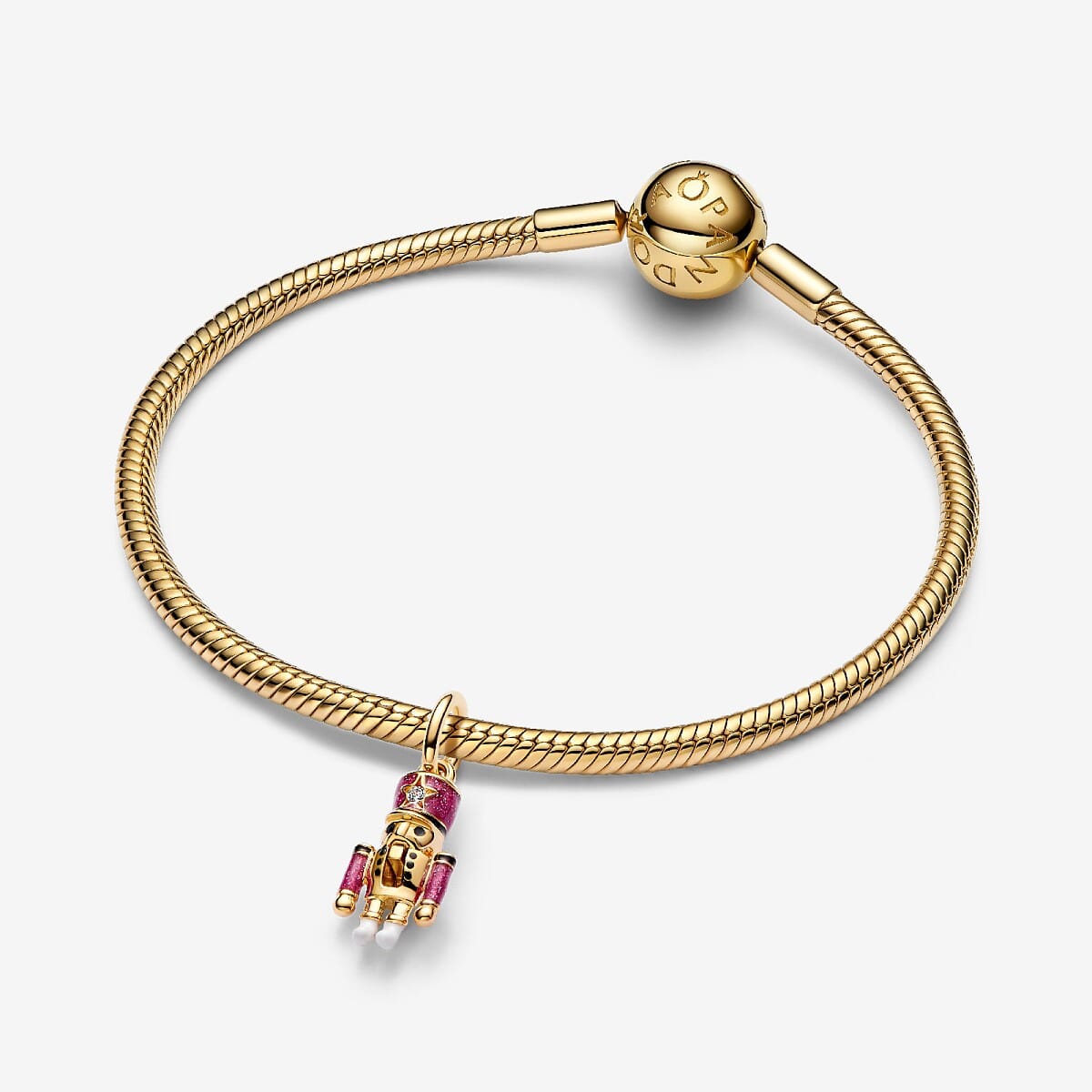Añade un toque festivo a tu pulsera Pandora con el Charm Colgante Cascanueces Móvil. Este encantador charm, con recubrimiento en oro de 14k y detalles de esmalte rosa brillante, presenta una circonita cúbica que adorna su sombrero. Un diseño único y mágico para celebrar la Navidad con estilo.