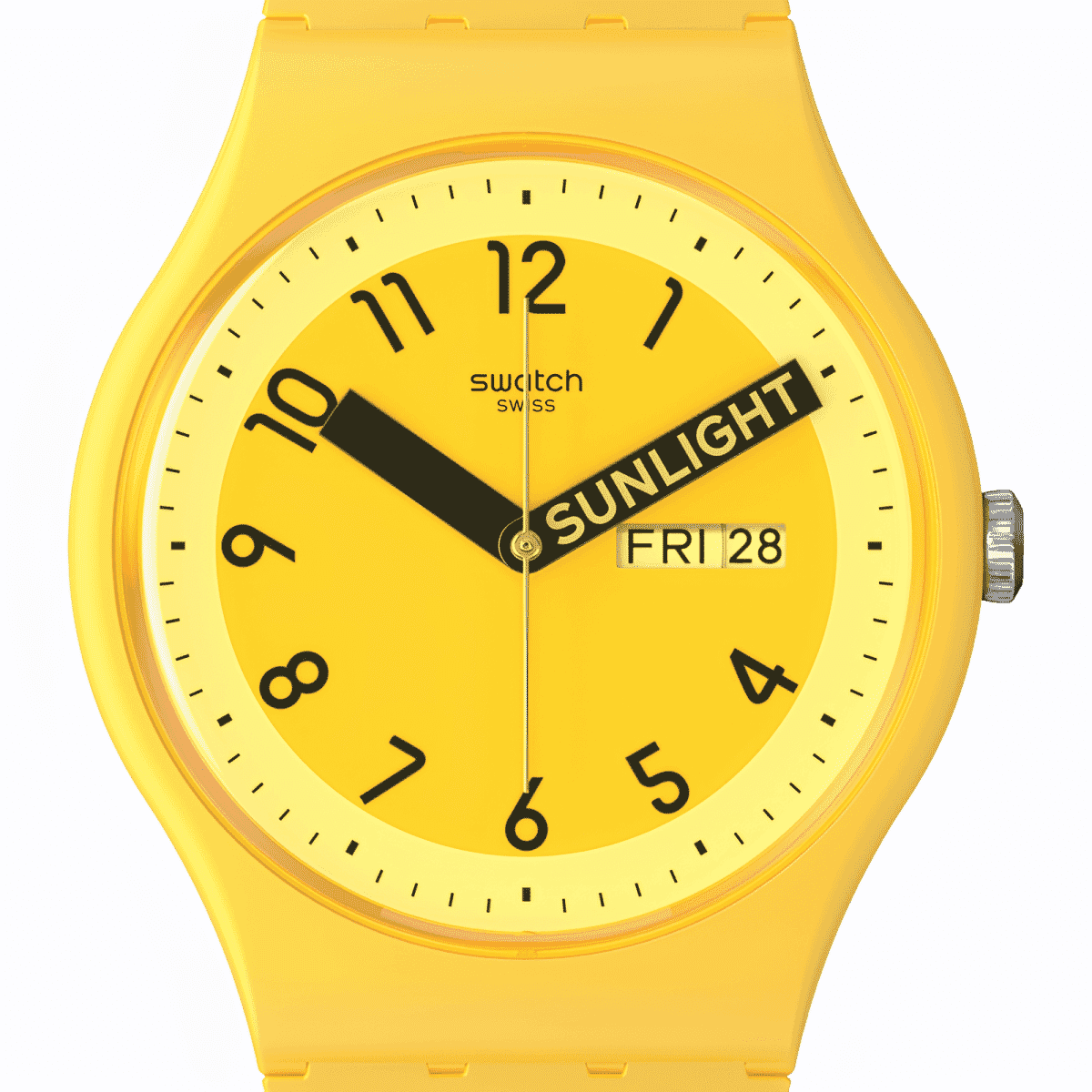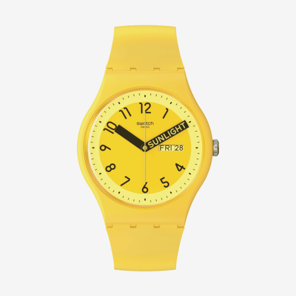 Este reloj especial para el Día del Orgullo 2023 de color amarillo presenta una esfera con distintos tonos amarillos, así como un cristal y una caja de origen biológico. Las agujas de este reloj son de color negro. En el minutero, además, se puede leer la palabra ‘sunlight’ (luz del sol), que hace referencia al color amarillo de la bandera del orgullo. La correa a juego de este reloj incluye dos trabillas especiales que, al unirlas, forman la bandera arco iris.
